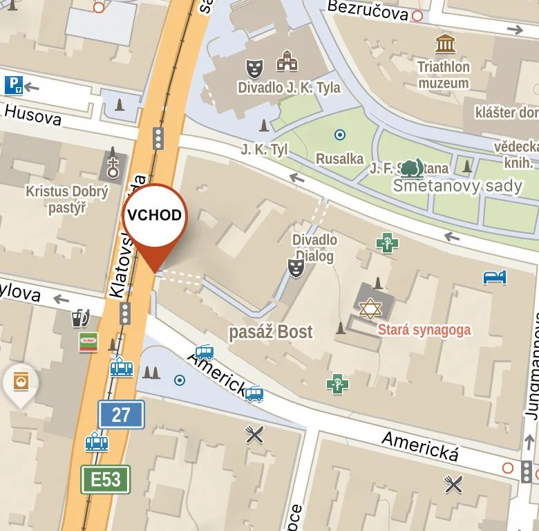 Najdete nás v pasáži BOST. Použijte vchod z ulice Klatovská třída. (Vchod ze Smetanových sadů je z důvodu rekonstrukce uzavřen.)